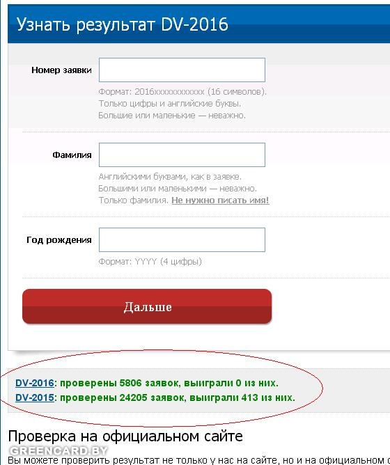 /lottery/results/ DV-2016: проверены 5806 заявок, выиграли 0 из них. DV-2015: проверены 24205 заявок, выиграли 413 из них. |